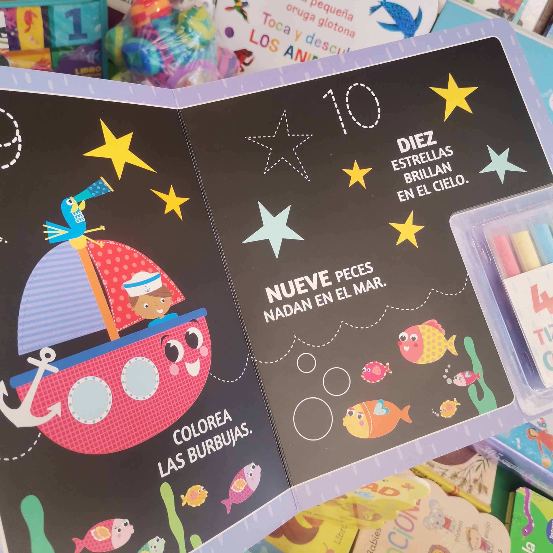 ¡Aprende a contar hasta diez! Traza los números y colorea los dibujos con las tizas para completar cada página.